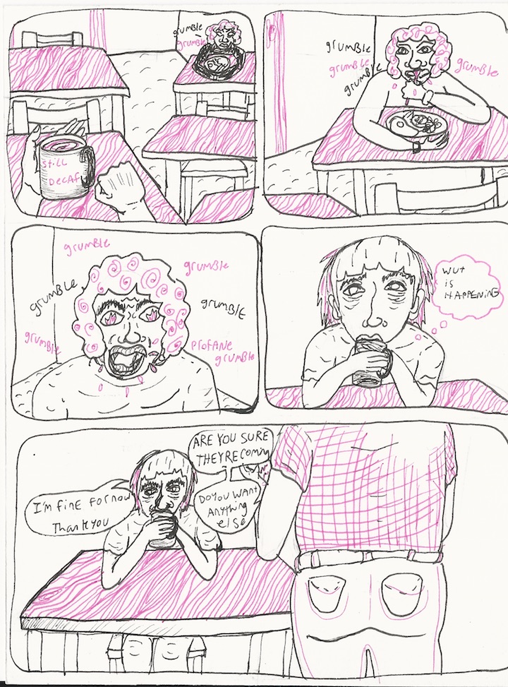 Dillon Lacey is a queer cartoonist and print maker living and working in Atlanta, GA. While they start their process autobiographically through notes and sketches they eventually take their true to life stories to their unrecognizable and illogical conclusion. With their themes focused around death, religion and alienation, they create dark comedy narratives that are hopefully relatable to the viewer, regardless of medium and format.